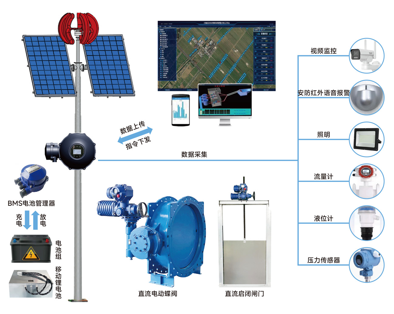 由太陽能光伏板和小型風(fēng)力發(fā)電機(jī)為蓄能電池組充電,電池組有BMS電池管理軟件管控,為永磁無刷直流電機(jī)的各類驅(qū)動裝置供電,同時為視頻監(jiān)控,壓力、流量、液位傳感器,照明等供電
